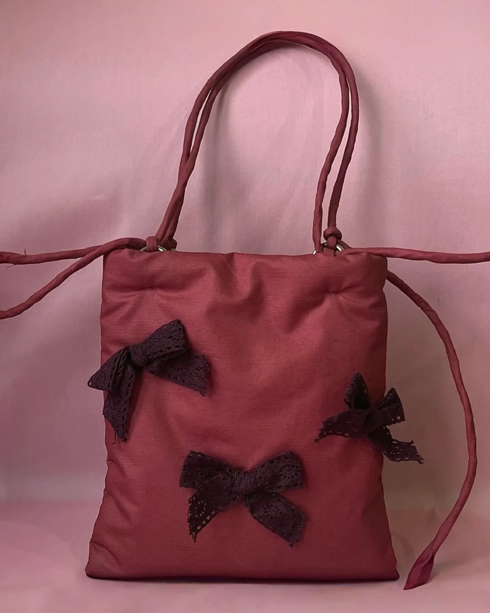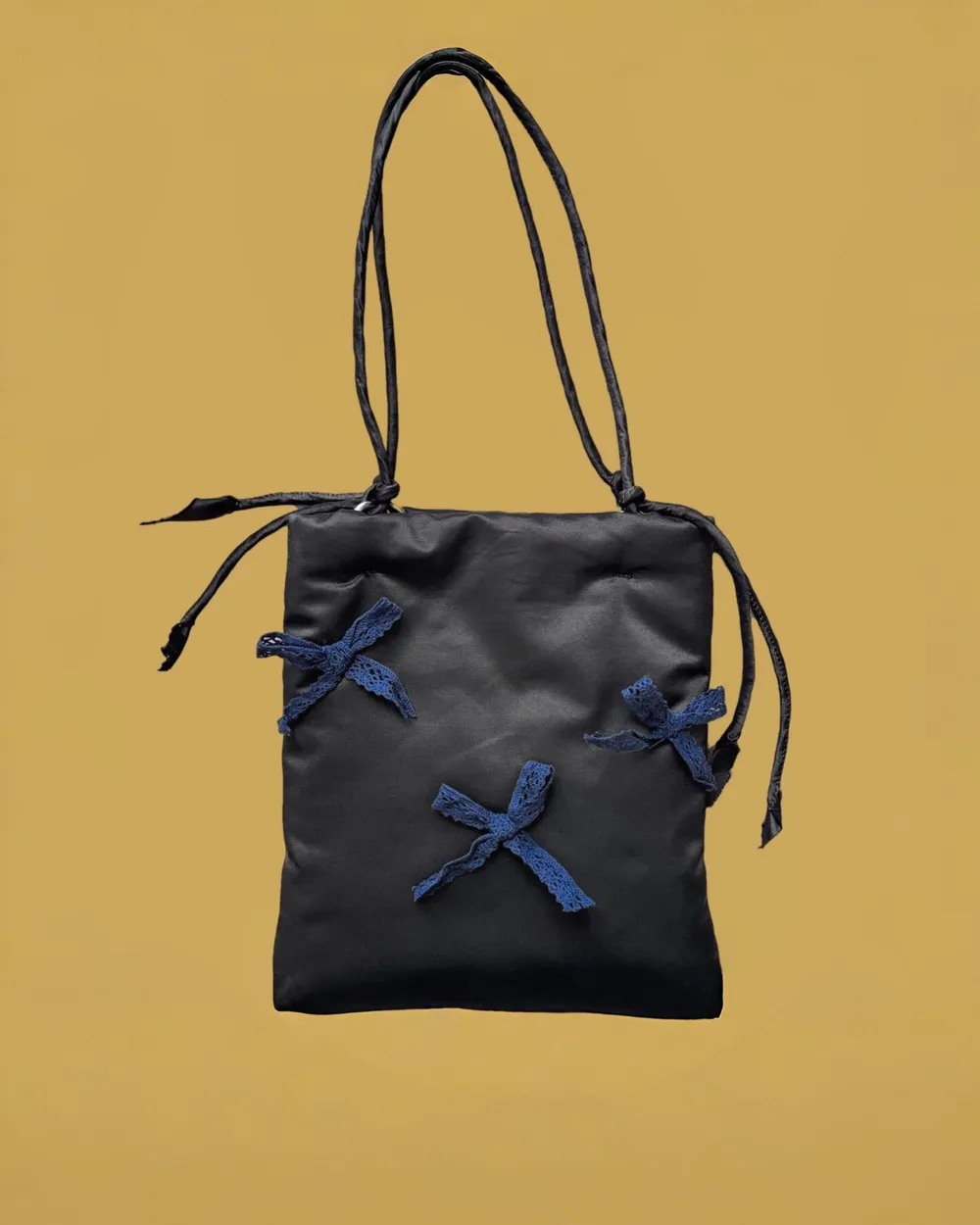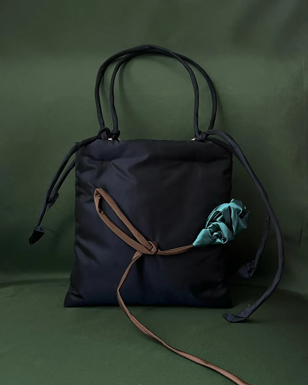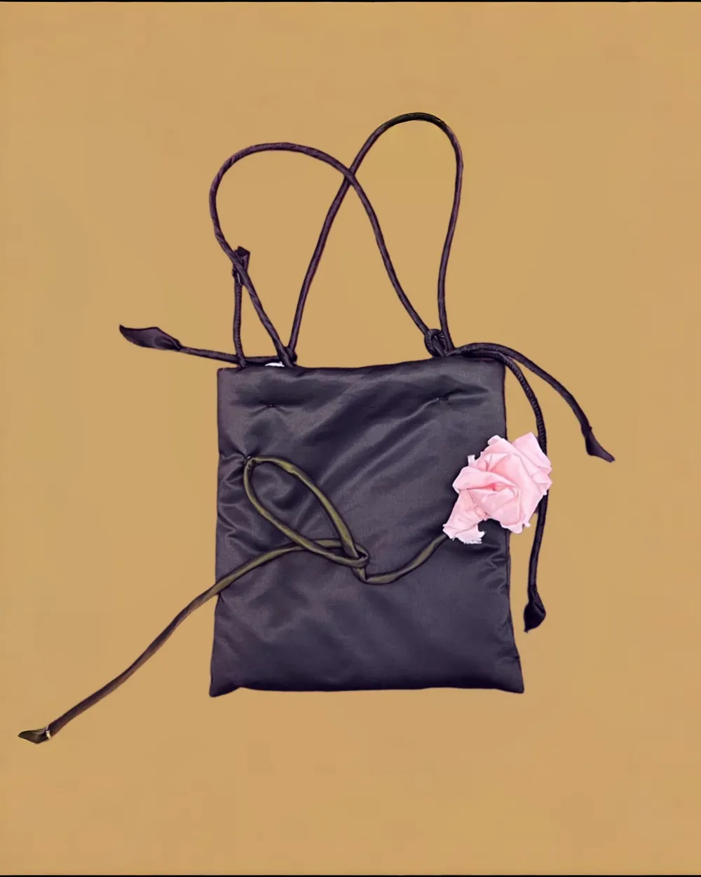 Small puffy square shoulder bag with a handmade detachable flower detail, replaceable with a lace ribbon. Each piece is handcrafted, with slight variations in the flower details.