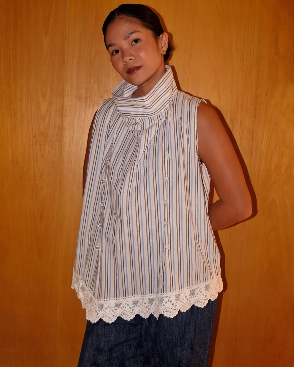 A sleeveless top with a high collar, adjustable buttons for a slim fit, and delicate cotton embroidery at the hem.