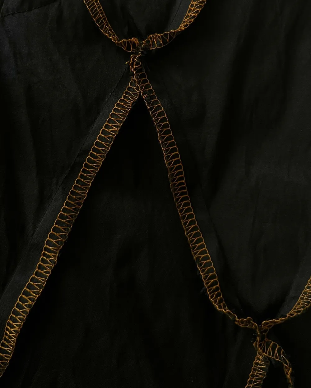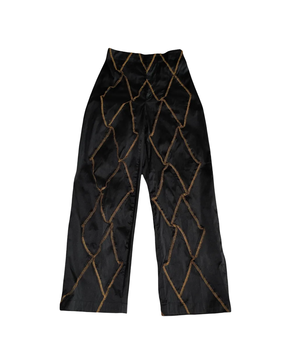 Trousers crafted from diagonal fabric panels joined with contrasting thread stitching. Designed with an elastic back waistband for comfort, these trousers showcase unique construction and craftsmanship.
