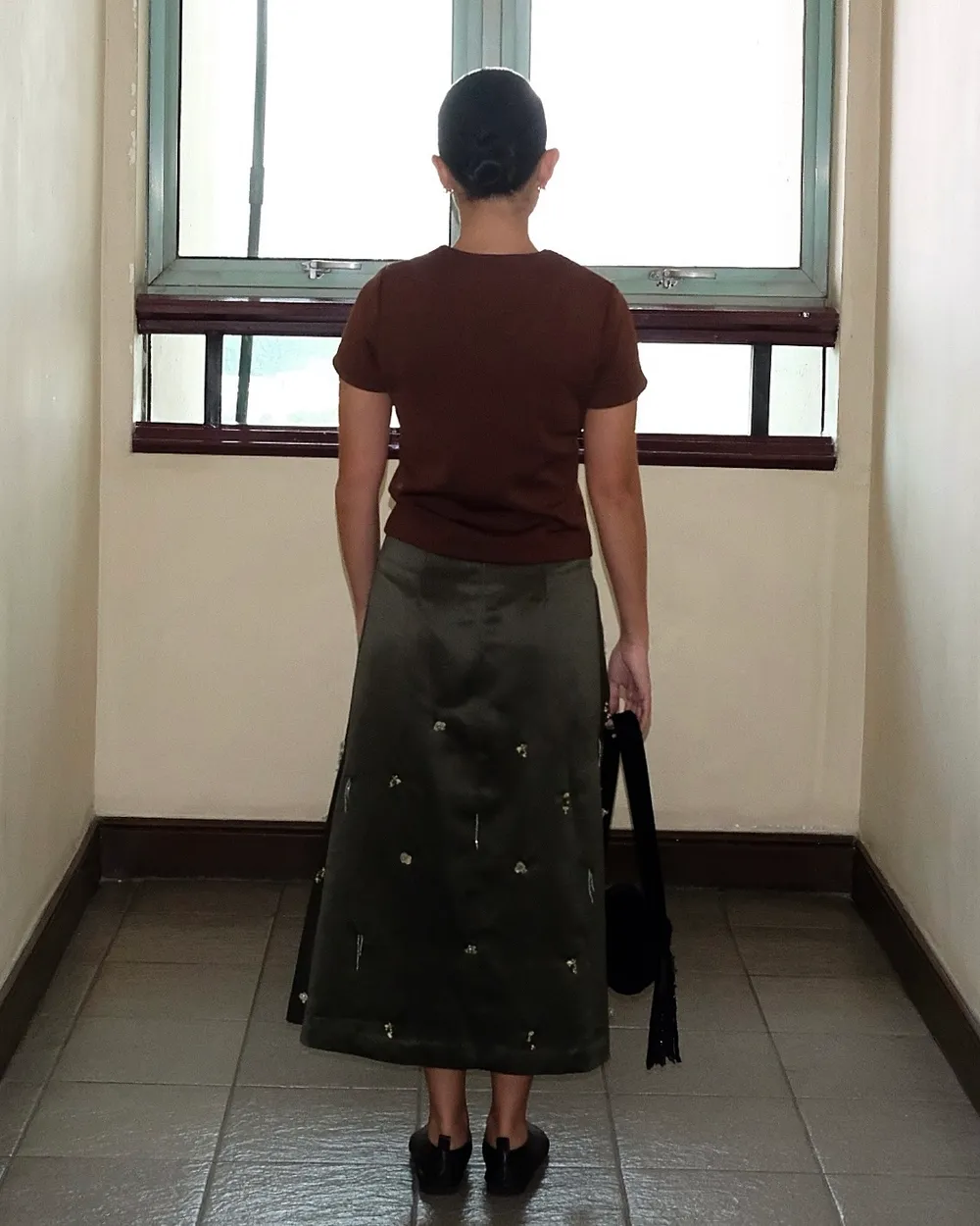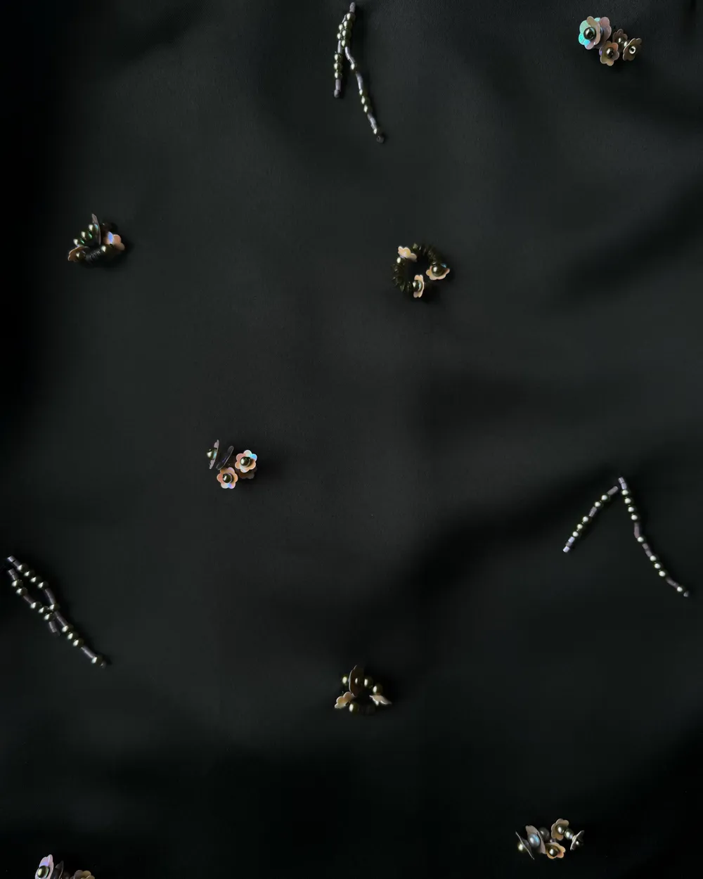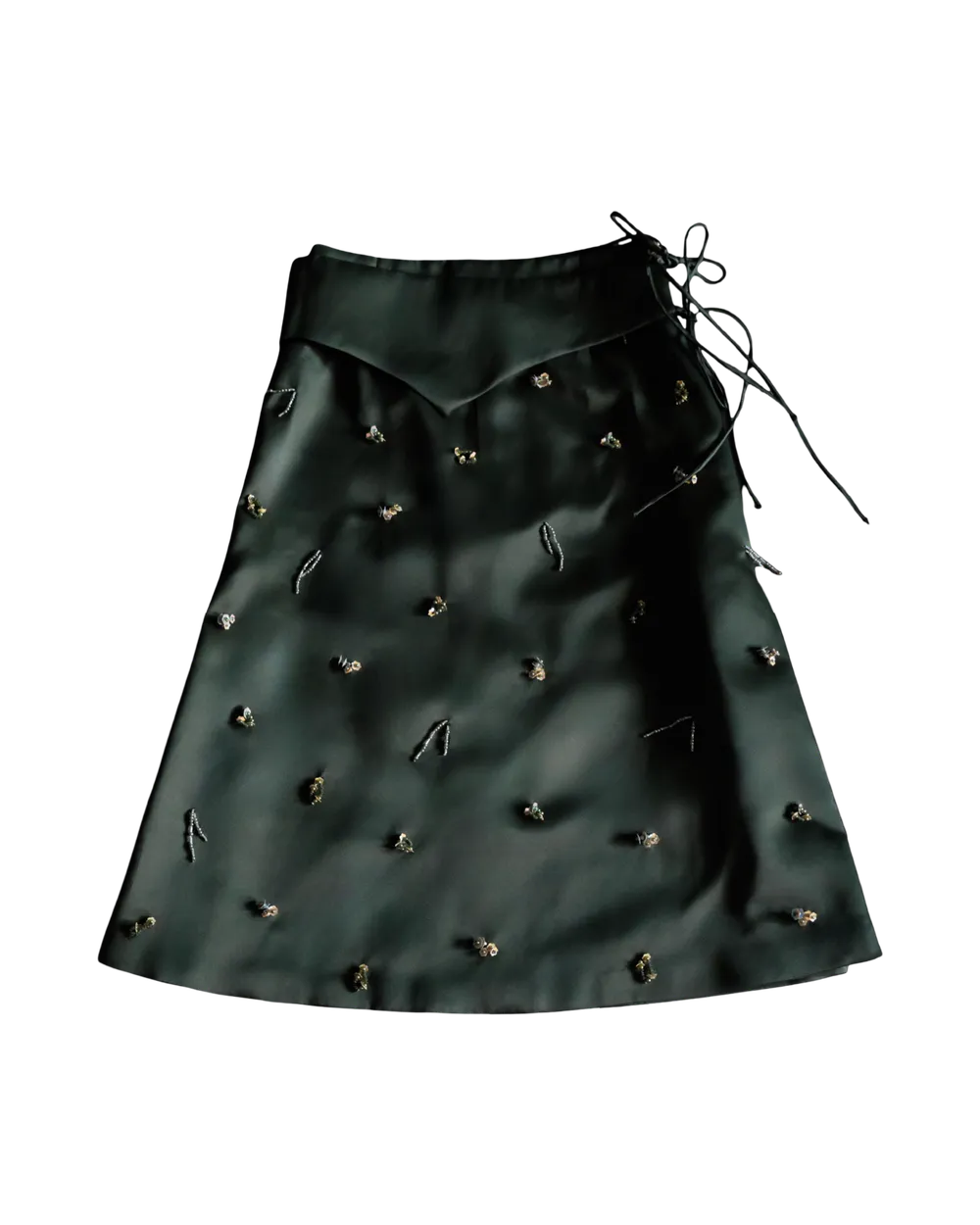 The new limited edition Lucca Skirt showcases an abstract floral pattern of sequins and pearls, each hand-stitched across the skirt. Includes a detachable belt for multiple styling options.