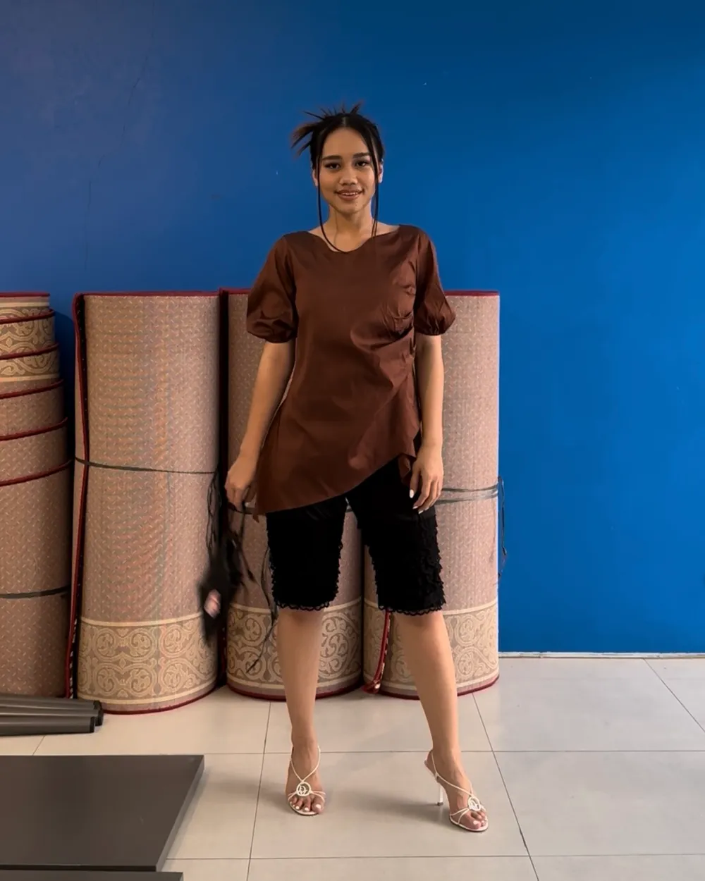 A relaxed top with an asymmetric cut and slightly puffy sleeves, creating a silhouette that feels both structured and effortless.